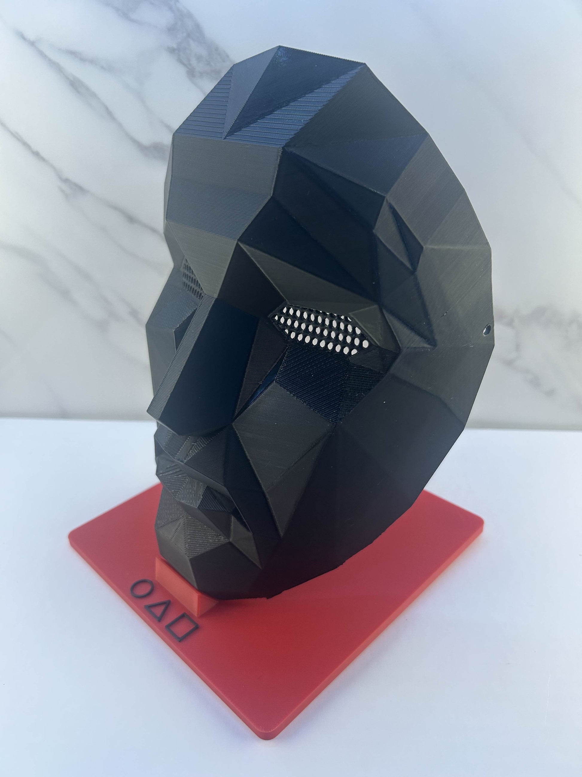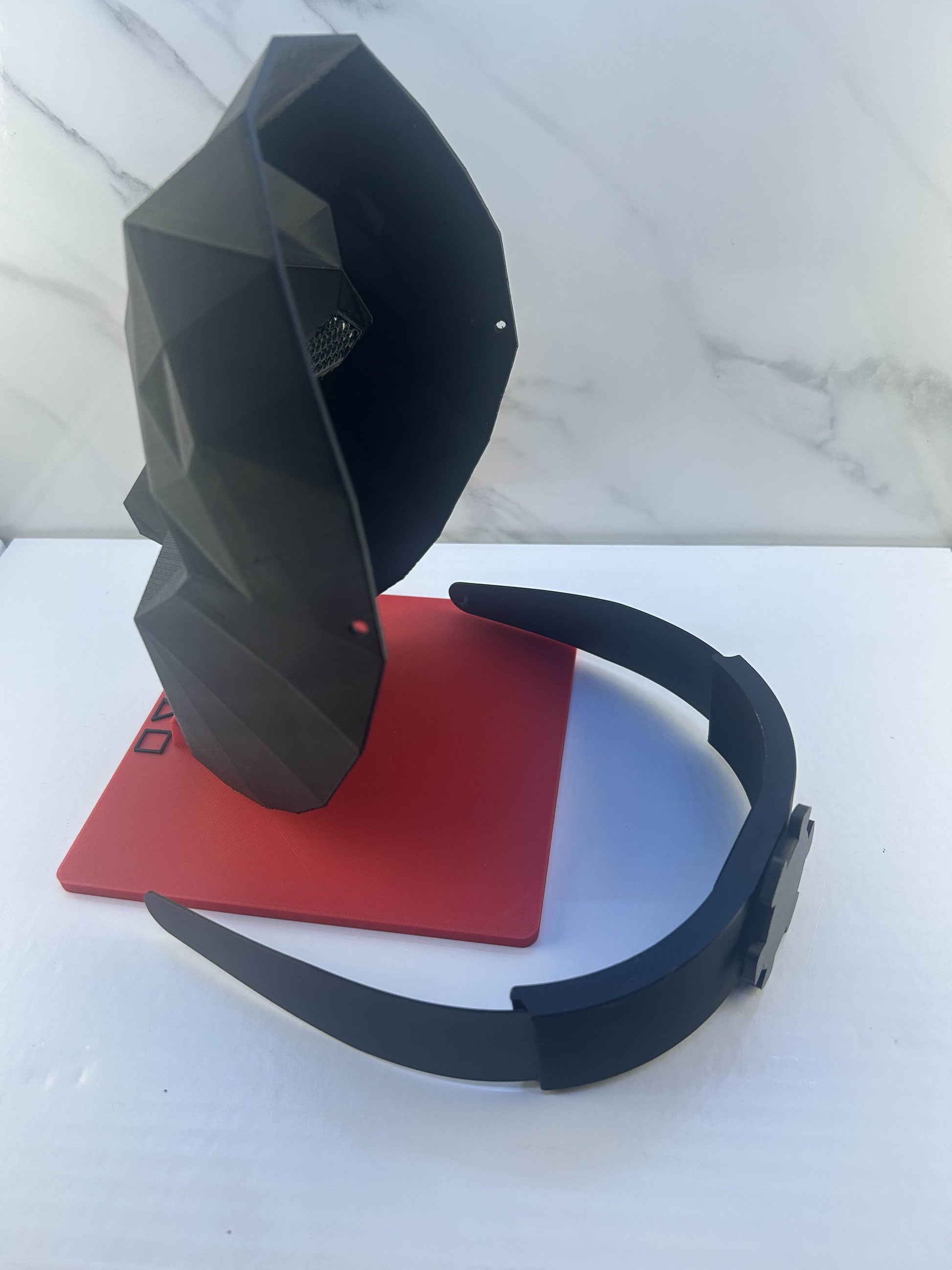 Masque du Boss noir de la série Squid Game, avec serre-tête inclus et support rouge pour un affichage élégant.